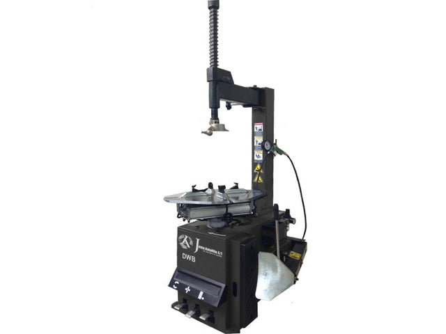 The tyre changer has swing tower that turns to the side so it is easy and quick to adjust the device to the mounted wheel on the turntable. DWB of course has a tire pressure gauge included in the price.